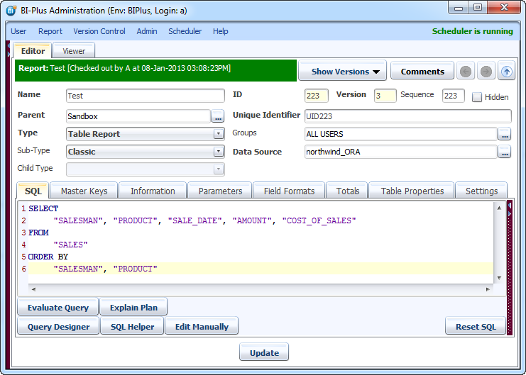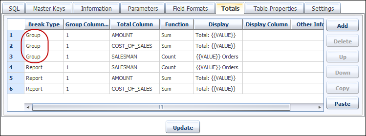 When adding group totals, it is recommended to have SQL that contains an order by clause, to sort the data into its logical groups. If you examine the SQL statement used to retrieve the data for this report, you will see that the dataset is ordered by SALESMAN. This provides a natural group break column.
