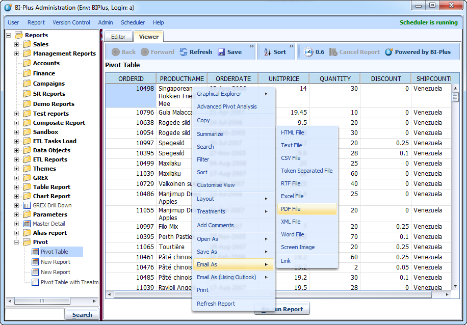 A report can be emailed directly from within BIPLUS without having to save the report first. Right click in the report ⇒ Email As menu and select preference format to open the Email dialog box.