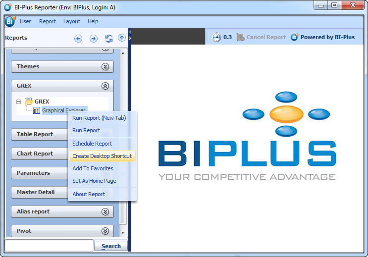 To create a desktop shortcut of one of the reports in the report tree, right click on the report name within the report tree(Reporter interface) to invoke a drop-down list, select create desktop shortcut.