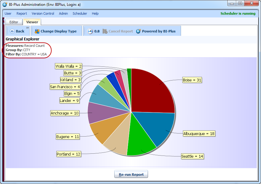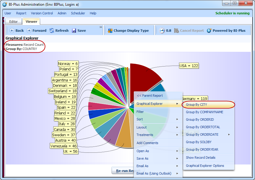 In result you will see that a pie chart is displaying record count for all orders which are group by COUNTRY. See upper left corner for Measure and Group by details. The default aggregation for GREX is count. One can also apply different types of aggregations which is described