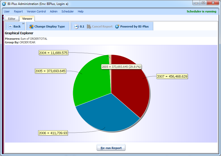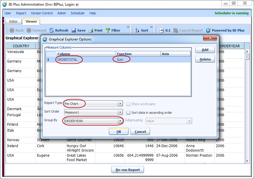 The user would like to analyze this report by seeing the total of the order totals, by year, in a pie chart. Right click in the report, click Graphical Explorer and select Graphical Explorer Options to invoke the Graphical Explorer Options Dialog Box.
