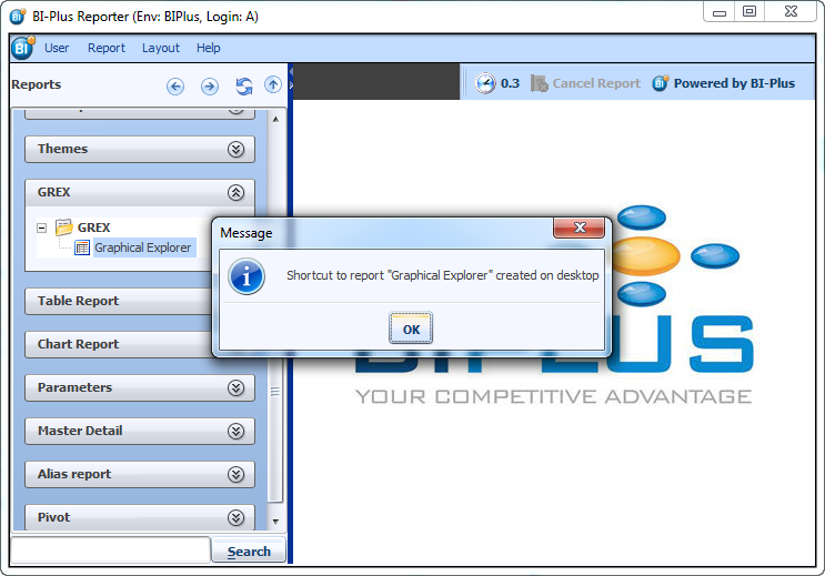 To open a report from a short cut, double-click the desktop shortcut icon. This will open the BIPLUS login window, type in user and password and select OK. BIPLUS will open with this report with GREX configuration if applied in Table Properties.