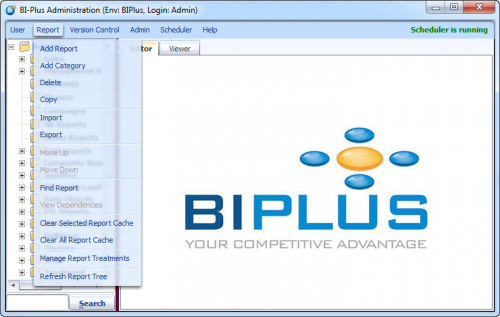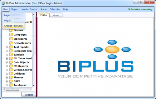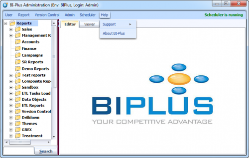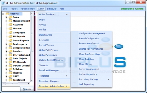 Scheduler menu contains Start/Stop scheduler, how to schedule a report and manage them and scheduling ETL jobs features.
